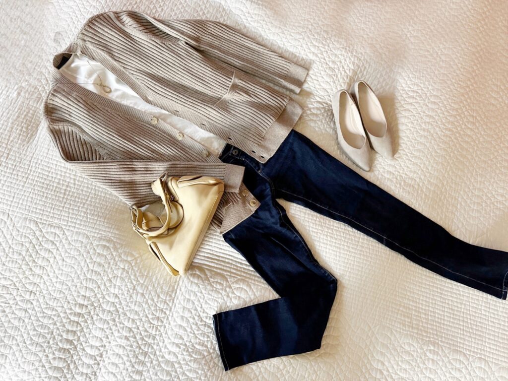 膝下まであるような「ロングカーディガン」は、羽織るだけで、縦に流れるIラインシルエットを簡単に作り出してくれる、優れたアイテムです。Tシャツとデニムといったシンプルな組み合わせの上に一枚加えるだけで、視覚効果によってスタイルがすっきりと見え、同時に、気になる腰回りやヒップのラインをさりげなくカバーしてくれます。選ぶ際は、薄手で、とろみのあるハイゲージニットのものがおすすめです。柔らかな素材感が、動くたびに優雅なドレープを生み出し、リラックスした中にも、エレガントな雰囲気を醸し出します。