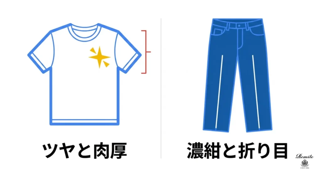- スーピマコットンや超長綿: 繊維が長いため、シルクのような自然な光沢があります。この「ツヤ」があるだけで、Tシャツ特有のカジュアルさが抑えられ、上品な印象になります。