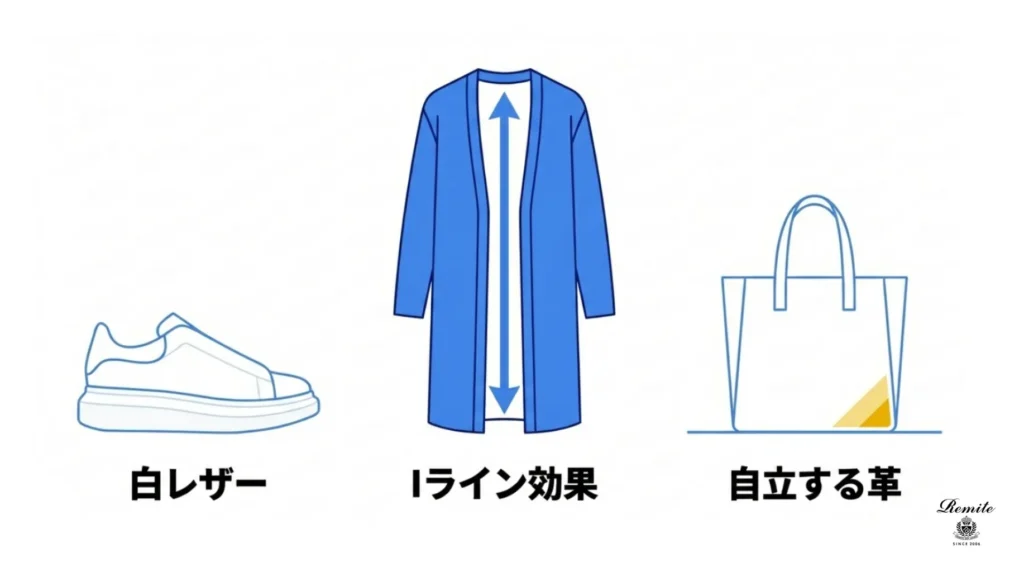 - ソールの厚みと色: ソール(底)まで全て同色のものを選ぶと、脚長効果が期待できます。また、3cm程度の適度な厚みがあるものは、地面からの衝撃を吸収し、歩きやすさも格段に向上します。